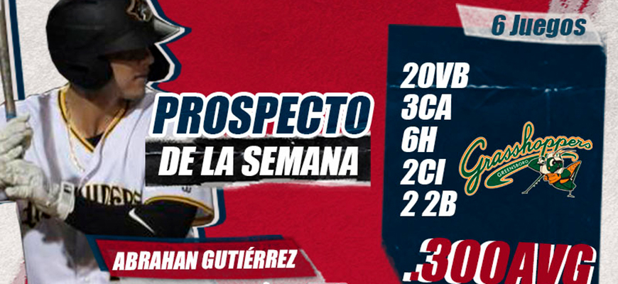 El joven receptor Abrahan Gutiérrez quién pertenece a Greensboro Grasshopers de la sucursal A de Piratas de Pittsburgh fue seleccionado como el prospecto de la semana después de haber estado consistente en sus turnos al bate.