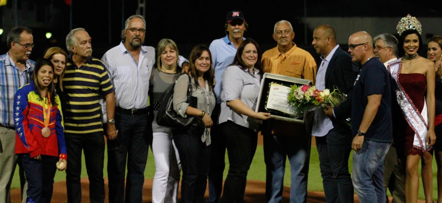 El momento emotivo de la noche llegó en la mitad del acto cuando la Directiva de la Fundación, Tigres de Aragua invitó al montículo a los familiares del fallecido, Presidente y Fundador de la novena aragüeña, Homero Díaz Osuna quienes fueron acompañados por el Presidente de la LVBP, Oscar Prieto Parraga y de su Jefe de Prensa, Alexander Mendoza para serles otorgada una placa como reconocimeinto a la labor de su padre en los Tigres, acto que fue acompañado por un minuto de silencio y un video con momentos más representativos de Díaz Osuna en la divisa aragüeña.